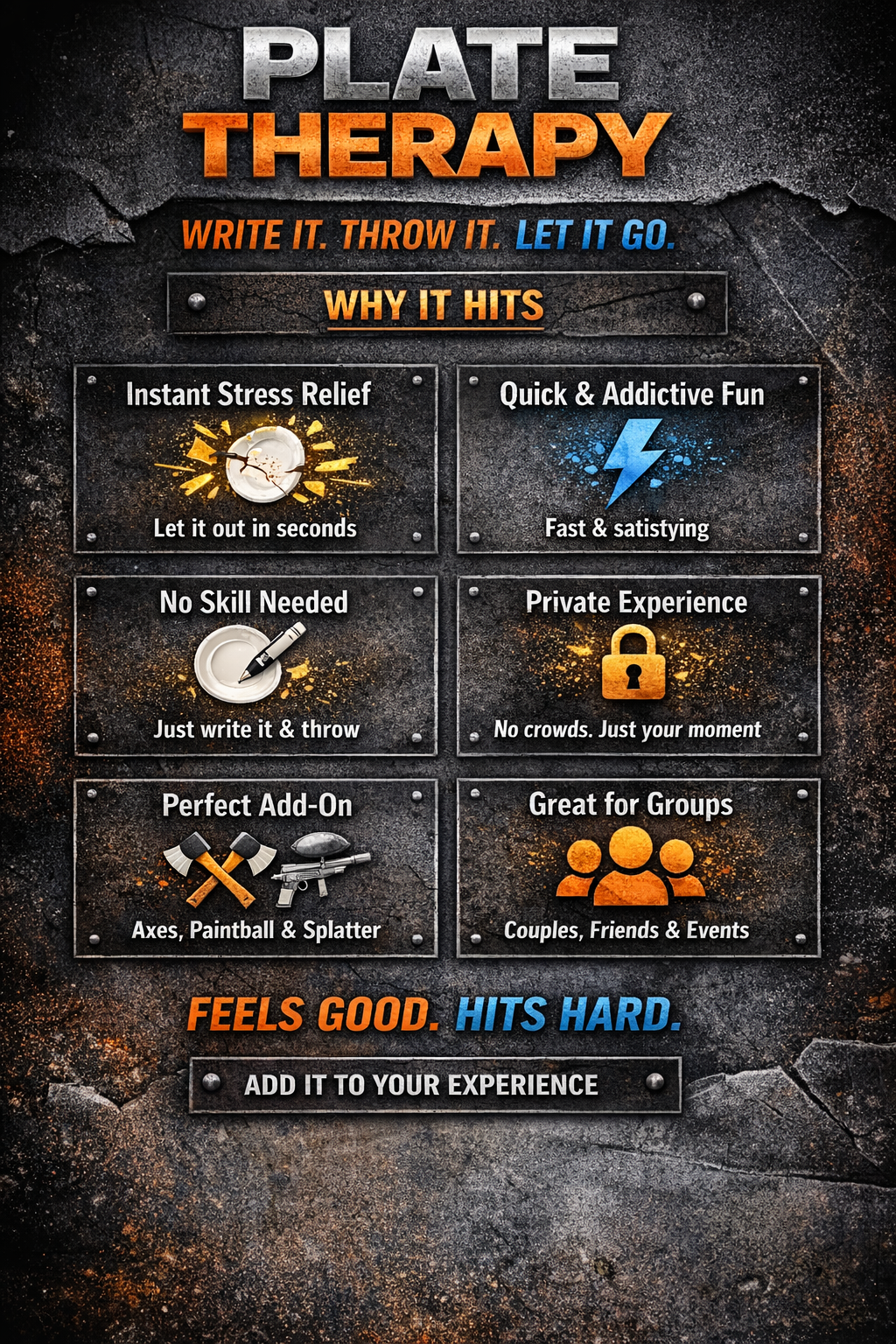 Upgrade your experience with Plate Therapy in Davie, FL β a fast, satisfying add-on designed to help you release stress and have fun. Write whatβs on your mind, step into the lane, and watch it shatter.
